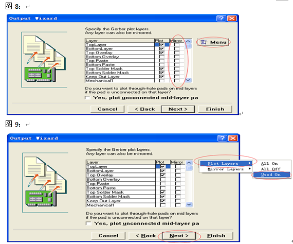6、 緊接著層的選擇,“Mirror”這欄的不需要勾選(圖8),勾選了層就會對不齊;然后選擇菜單只需要用到的層“Menu→Plot Layers→Used On”(圖9),選好后點擊Next: