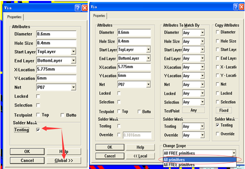 在轉換雙面板時,一般過孔都是不開窗的,當然在CAM軟件里可以處理這樣的問題,如果我們在轉換原PCB文件時就處理好就會很方便了!在打開文件沒轉 GERBER之前,用鼠標雙擊過孔進行勾選設置“Tentingd的√去掉→Global→選All primitives→OK”(如下圖),轉出來的GERBER里,過孔就沒有綠油開窗了!