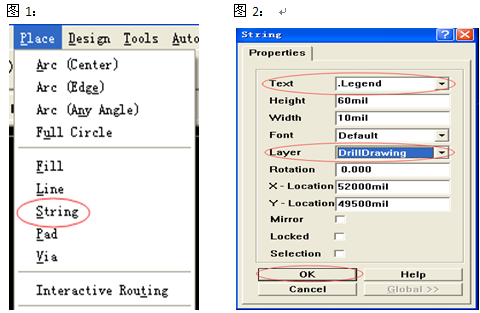 1、 先打開PCB圖檔,最好先檢查一遍PCB圖檔是否有問題,確認沒問題后放孔徑標記列表;工具欄 :Place→String(快捷方式:P+S)(圖1),出現字符串“string”按Tab鍵出現對話框后選擇“.Legend”“DrillDrawing”再按OK(圖2):